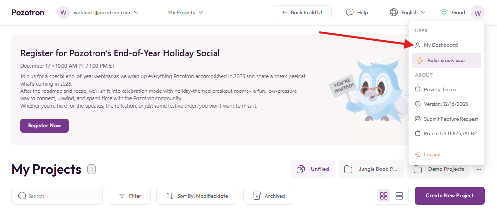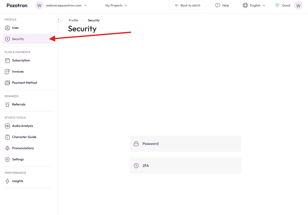 When logged in to your Pozotron account, click your email in the top right corner of the page and select Profile.