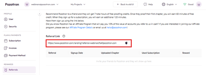 - When logged in, click on your email address in the top right corner of your screen. or simply click this link: https://studio.pozotron.com/profile/referrals