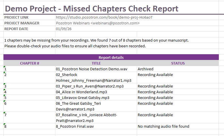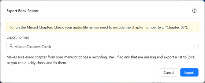 Click Export, and you will see an Excel file begin downloading! You can then open this to view all missing recordings from your project: