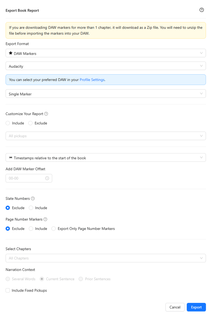 - Timestamps: This option lets you choose a timestamp relative to the start of the entire book or to the start of each audio file. This depends on your DAW session setup.