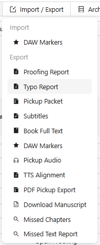 To access and share a typo report, you can do so from the Import/Export button in your proofing page.